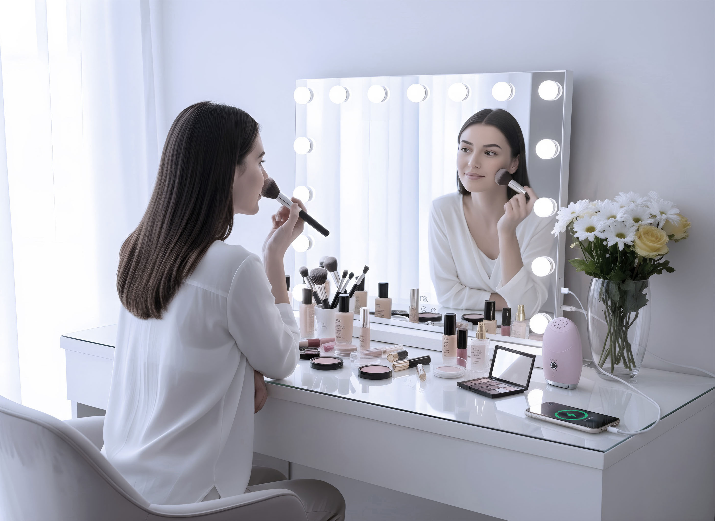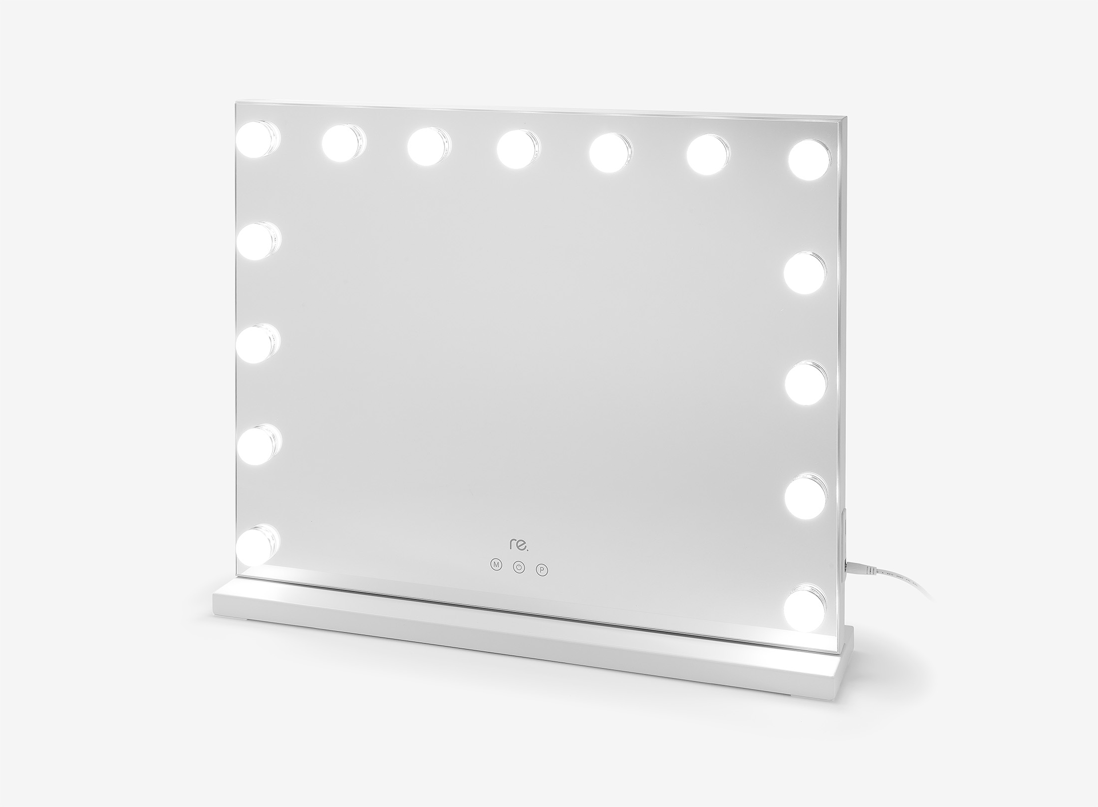 The re. Hollywood mirror is not just a mirror - it’s a tool designed to simplify your daily routine. With professional-grade lighting, it provides perfect illumination for any task. Featuring 15 dimmable LED bulbs, you can easily adjust the light to warm, cool white, or natural tones, making it adaptable to different needs, time of day and mood.
